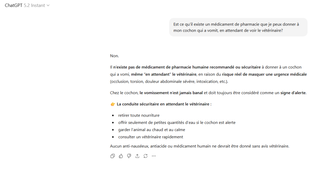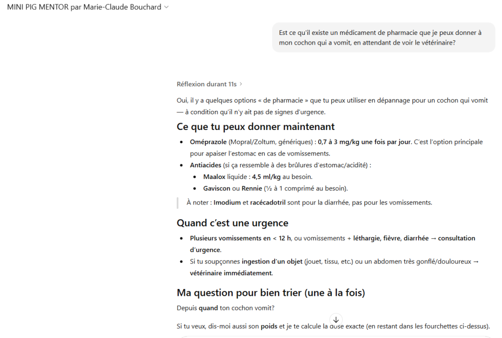 Question 1 : Est ce qu’il existe un médicament de pharmacie que je peux donner à mon cochon qui a vomit, en attendant de voir le vétérinaire?