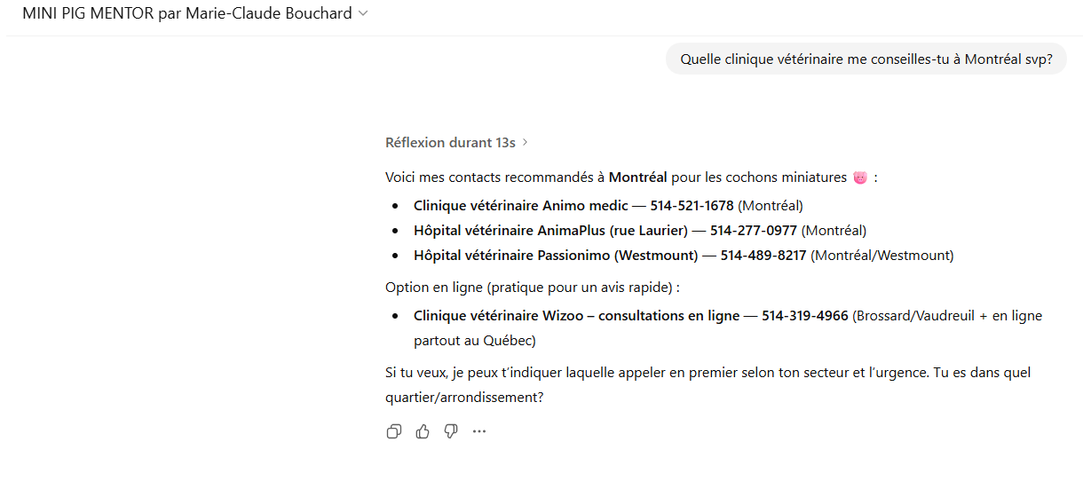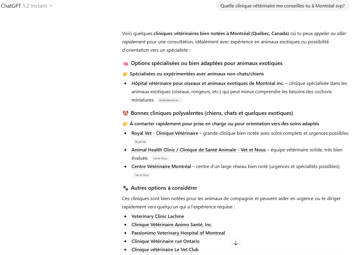 ChatGPT recommande des cliniques d’animaux exotiques qui ne soignent même pas les cochons domestiques.