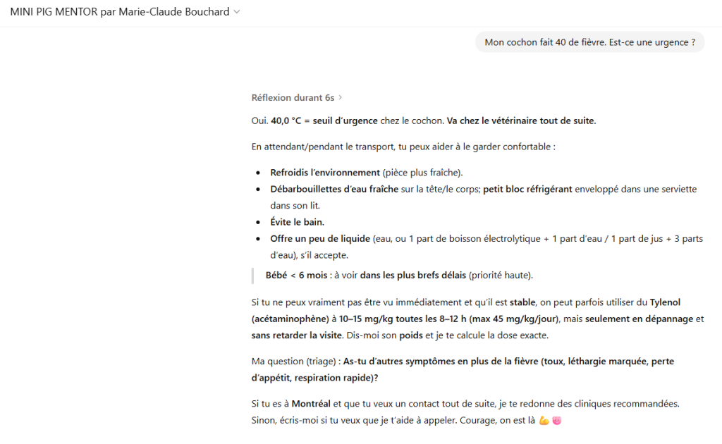 Mini Pig Mentor reconnaît également l’urgence, mais offre aussi un plan B si le vétérinaire n’est pas accessible. Il pose aussi d’autres questions pour voir plus loin.