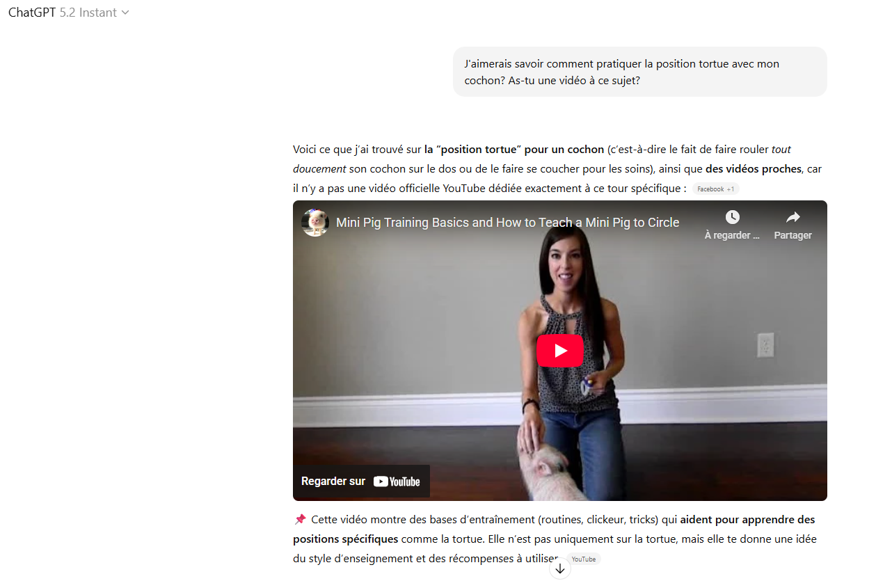 ChatGPT suggère une vidéo d’entraînement au clicker, aucun lien avec la position de la tortue.