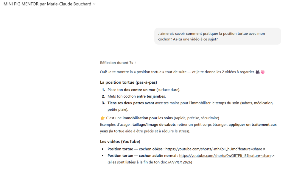Mini Pig Mentor explique la position tortue, en plus de suggérer des vidéos de Marie-Claude qui démontre la position pour appuyer l’explication.