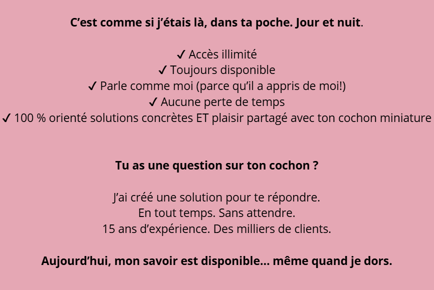 J'ai posé au moins 90 questions et WOW ca dépasse mes attentes ! Comme nouvelle famille d'un cochon adulte, j'ai trouvé des réponses à mes questions + des plans d'aide personnalisés. Tout y est, et surtout comment agir !